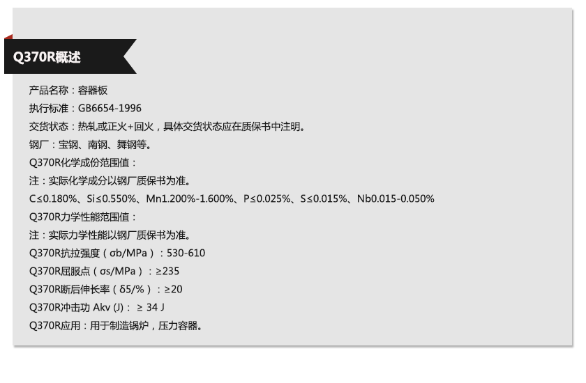 Q370R板材可分别称为Q370R合金钢板、Q370R钢板、Q370R卷板、Q370R开平板、Q370R带钢、Q370R冷轧板、Q370R热轧板、Q370R薄板、Q370R中板、Q370R厚板、Q370R特厚板等。